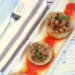Ligamos el relleno con dos cucharadas de tomate frito y rellenamos los cascos de cebolla con cuidado para que mantengan la forma. Los servimos sobre una cama de tomate frito adornando cada ceblla con una ramita de hierbas aromáticas.