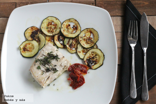 - Dos trozos de unos 200 gr de lomo pez limón, aceite de oliva, tomillo fresco, 1 calabacín mediano o dos pequeños, sal al gusto