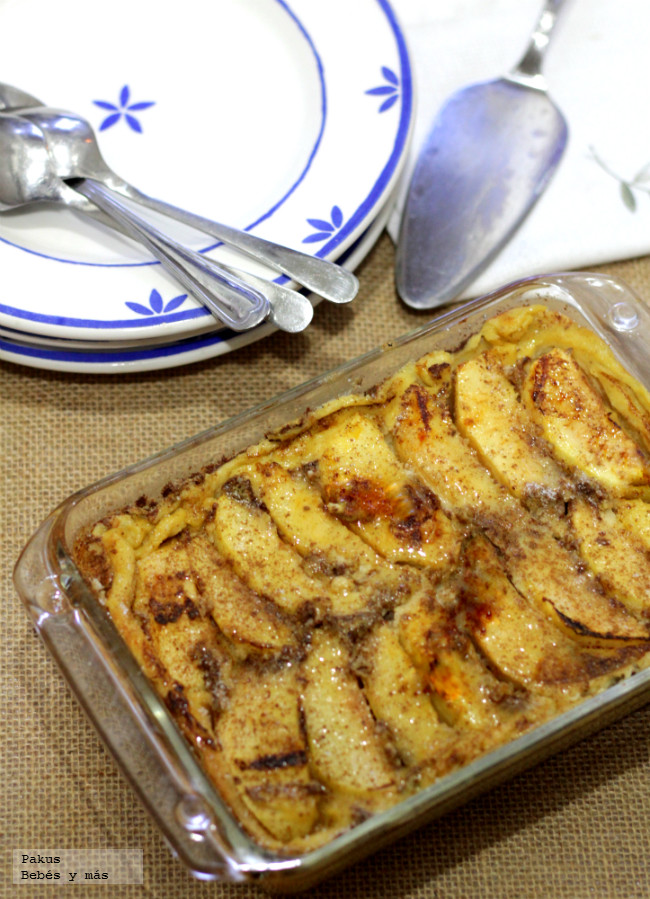 - 2 manzanas, 2 huevos, 25 g de azúcar, 30 g de harina, 150 ml de leche, 2 cucharaditas de canela