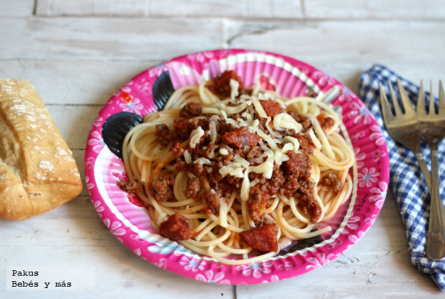 Cocemos la pasta según las indicaciones del fabricante hasta que esté en su punto. Con los niños es mejor pasar un poco la pasta ya que no les suele gustar tanto que esté al dente. En cada plato, servimos primero los espaguetis, encima una buena cucharada de salsa y sobre ella unas hebras de queso rallado.