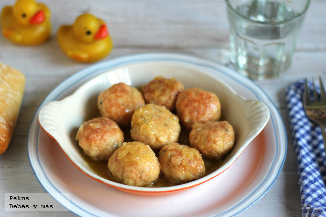 Mi madre siempre me cuenta que las llamábamos pelotitas, quizás porque ella utilizaba el mismo truco que yo para hacernos comer de todo utilizando nombres como el de los lenguados enrollados. El caso es que con estas albóndigas caseras de pollo, tan tiernas y tan blanquitas no váis a necesitar usar ningún truco para que se las coman estupendamente.