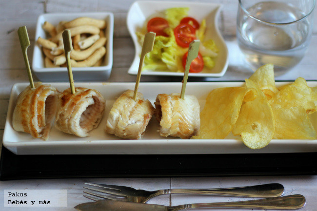 Cuando tenemos los cuatro lomos, los enrollamos sobre sí mismos con cuidado de que no se partan y sujetamos cada uno con un palillo para que se mantengan enrollados. Como premio a los comensales, hoy les ponemos unas patatitas chips de guarnición, además de un platito de ensalada de tomate y lechuga "pepinera".