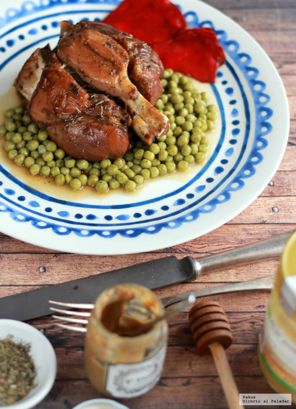 Codillo asado a la belga con guarnición de guisantes (foto de portada), que se elabora con un codillo precocinado y pocos ingredientes más, de manera que prácticamente todo el trabajo lo hace el horno.