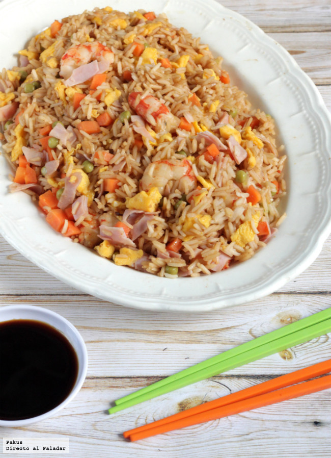 Arroz tres delicias o arroz frito chino (foto de portada), un plato ligero y con verduras que podemos aderezar al gusto. Con zanahoria, guisantes, huevo, jamón cocido y gambas, se puede incluir los ingredientes que más les gusten a los peques y será un éxito seguro. ¿Podremos comerlo con palillos?