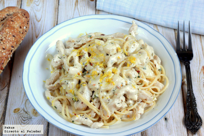 Receta sencilla de espaguetis con salsa cremosa de pollo, tomillo y limón: El toque fundamental de esta receta viene dado por la aportación de la ralladur de limón, que le da un aroma y frescor muy especial. Seguro que os llamará la atención la utilización de este ingrediente en lugar de queso rallado, pero cuando lo probéis, os sorprenderá muy gratamente.