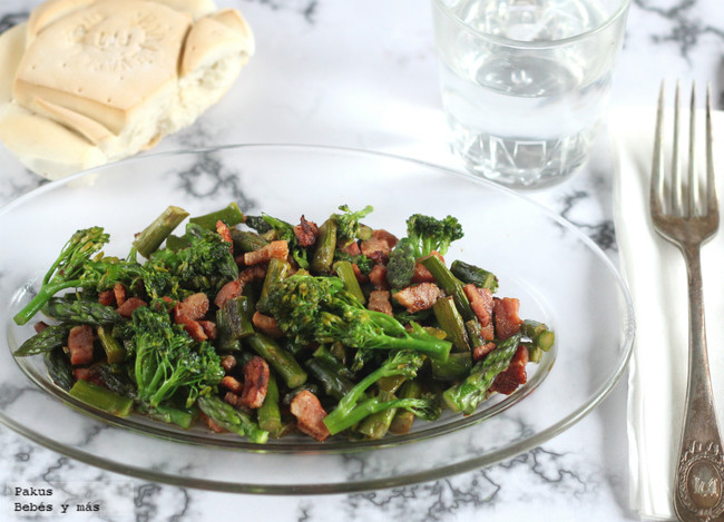 Esta receta de salteado de bimi con espárragos y lacón es ideal como plato único a la hora de la cena. Con una ración de pan y una pieza de fruta os sentiréis bien saciados, debido a su alto contenido en fibra.