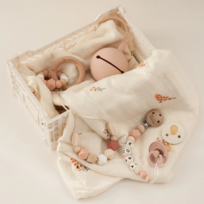 Sin duda, esta es una de las canastillas más bonitas que podemos encontrar. Contiene una muselina de algodón orgánico súper grande (120x120cm), y extra suave, modelo Flowers de la marca Mushie, un portachupetes de silicona color Blush de la marca Mushie, un pack de dos chupetes Bibs de caucho natural en colores a juego, sumamente ligeros, de apariencia clásica, atemporal y de aspecto elegante. También un chupetero personalizado con el nombre del bebé y colores a juego con la muselina, un mordedor de silicona antibacteriana y madera natural de haya a juego con la muselina y una preciosa caja kraft con cinta de algodón natural o una caja de almacenaje Lillemor. Disponible a partir de 81,70 euros en Be Mummy.