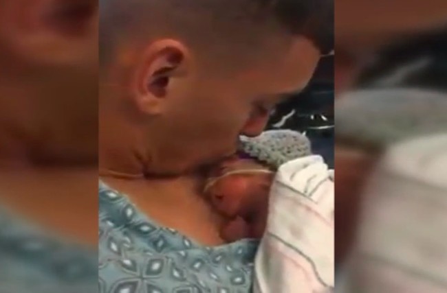 Colocar al bebé piel con piel como hace este papá con su bebé es lo más recomendable para bebés nacidos antes de término. Les ayuda a regular la frecuencia respiratoria, cardiaca y la temperatura, así como a aliviar el estrés y la ansiedad. Es donde más a gusto pueden estar, y así lo vemos a juzgar por la reacción que tiene el bebé al recibir un beso de su padre.