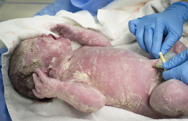 ¿Veis al bebé de la foto, lleno de una sustancia amarillenta? Los bebés nacen así. Unos tienen más y otros tienen menos, pero llegan al mundo con la misma sustancia que les protegía dentro del útero, la vérnix caseosa.