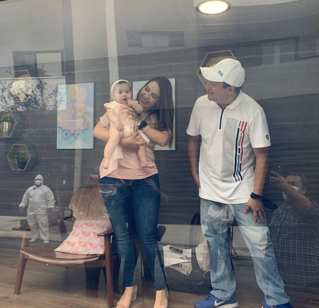 Separados por la pantalla de una cabina desinfectada y climatizada en la parte trasera de un camión, los padres pueden presentar al recién nacido a su familia, mientras no sea seguro hacerlo en directo por la pandemia de Covid-19.