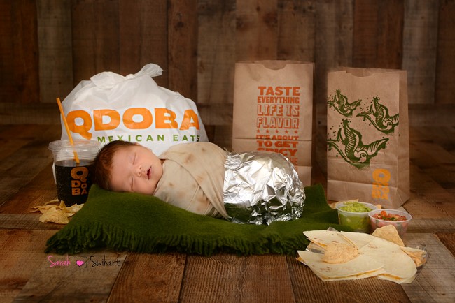 Sin duda es una de las fotografías de recién nacido más divertidas y originales que hemos visto, y además de hacer referencia al lugar en el que se conocieron sus padres, el bebé burrito está para comérselo a besos.