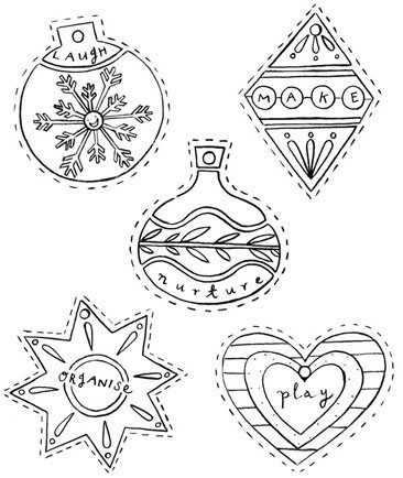 Los niños pueden decorarlos como más les guste, con rotuladores, ceras, pegando papelitos o con purpurina. Luego sólo queda recortarlos por la línea de puntos, hacer un pequeño agujero, colocarles un hilo y ya están listos para colgarlos en el árbol.