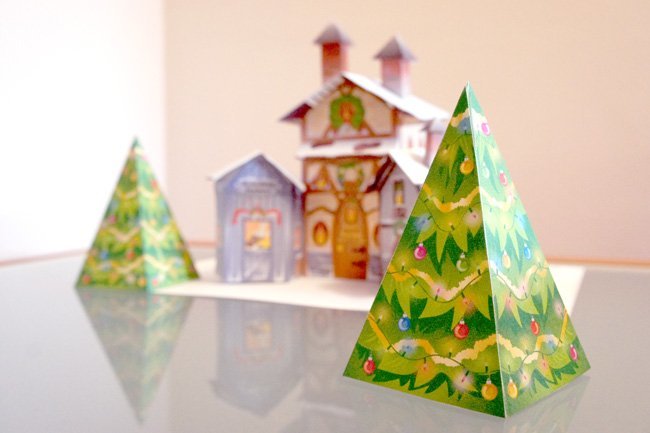 Pues bien, ahora podemos añadir más decorado con unos preciosos árboles de Navidad que ya vienen con su decoración para imprimir, recortar y montar en unos segundos, ya que son sencillísimos de hacer.