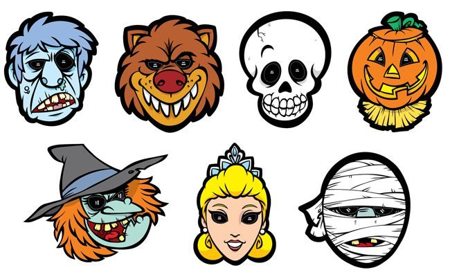 La gracia de ofrecer variedad a los niños es que así pueden escoger la máscara que más les gusta o la que menos miedo les hace, que no todas tienen por qué parecerles graciosas. Como podéis ver hay máscaras de Drácula, de Frankenstein y de la Momia y otras más genéricas como las máscaras de Pirata, de Bruja o de Princesa, que tanto puede ser una princesa buena como una malvada Reina como las de los cuentos.