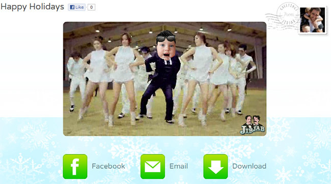 Para estos días han decidido aprovechar el tirón impresionante que tiene el Gangnam Style y nos traen la posibilidad de hacer, con el vídeo oficial de fondo, un vídeo de nuestro hijo bailando el Gangnam Style, que me da la impresión que quieren que utilicemos como vídeo para felicitar la Navidad, por el fondo nevado que se aprecia en la página.
