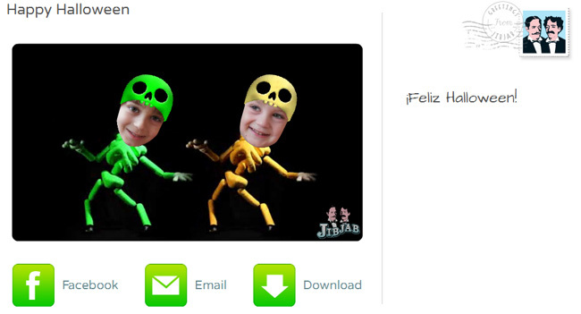Quedan un par de semanas para Halloween y el ambiente se está tornando cada vez más tenebroso, con murciélagos, calabazas, telas de araña y brujas como decoración en las tiendas y la gente de JibJab, conocidos por ser los autores de los vídeos de los elfos navideños, han decidido ofrecer gratis (hay más vídeos, pero hay que pagar para hacerlos) la posibilidad de hacer un vídeo de tus hijos haciendo el baile del esqueleto.