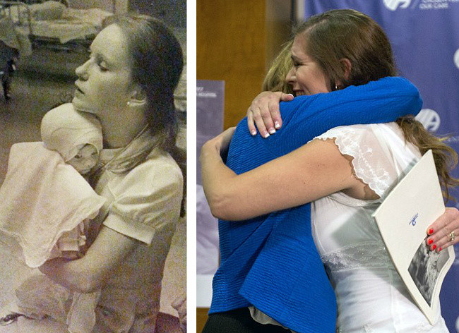 Es la historia de Amanda Scarpinati, una mujer de 38 años que cuando era bebé sufrió diversas quemaduras en la cabeza, en las manos y en los pies con un vaporizador (aún ahora tiene las cicatrices). En el hospital, una enfermera cuidó de ella, la acunó en sus brazos cuando lo necesitaba, y de ese momento se hicieron algunas fotos que se utilizaron en el anuario del hospital. No quedó registro de su nombre, pero Amanda encontró las imágenes y buscó a la enfermera sin éxito durante 20 años. Ahora, casi 40 años después de esas fotos se reencuentra con la enfermera para devolverle el abrazo que ella le dio mientras le cuidaba.