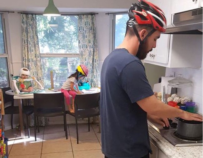 Al ver al bebé con casco, su hermana Camila, de tres años, tuvo la gran ocurrencia de ponerse su casco de bici de color rosa para estar igual que Jonas, y su padre Gary, también se sumó a la idea.