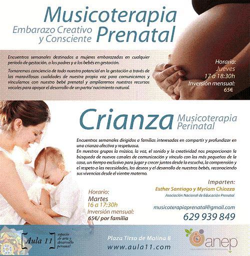 La Musicoterapia es un recurso educativo, preventivo y terapéutico, una herramienta que busca un cambio para desarrollar y generar actitudes de toma de conciencia, respeto y vínculo hacia el bebé intrauterino y el bebé a través del proceso creativo. Os presento hoy unos talleres de musicoterapia prenatal y de crianza que tienen lugar en el Aula 11, situada en Tirso de Molina, en Madrid.