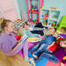 Así, cuando los niños llegan al aula después del almuerzo, lo único que deben hacer es guardar su material escolar bajo la cajonera de su mesa y accionar una palanca para que el pupitre se eleve por encima de sus cabezas, dejando un espacio diáfano en el aula para poder dormir sobre hamacas reclinables.