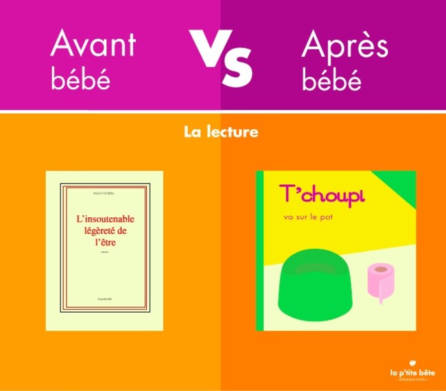 Según la ilustración, pasamos de "La insoportable levedad del ser" a libros infantiles sobre cómo usar el orinal. Y, bueno, es cierto que puede que no fuéramos aficionados a la novela filosófica, pero es que cualquier libro, cualquier revista, cualquier tema que nos interesara pasa a ser secundario, al menos durante un tiempo. No tiréis los libros de vuestros autores favoritos: volveréis a encontrar tiempo para ellos (¡tarde o temprano!).