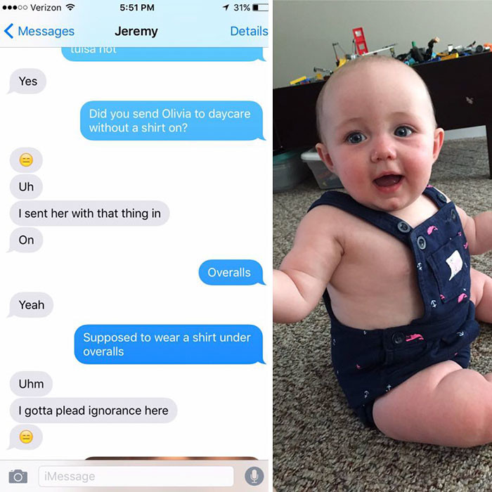Capturó el momento con el móvil, se lo mandó y le preguntó: "¿Has llevado a Olivia a la guardería sin camiseta?". Era obvio que sí, pero oye, igual todo tenía una explicación perfectamente lógica.