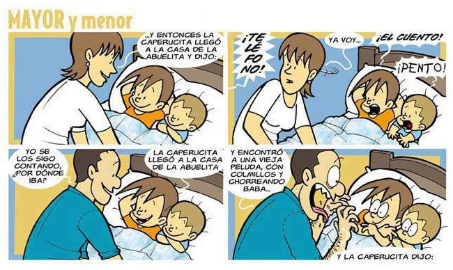 Para ilustrar mis palabras nada mejor que esta viñeta de Mayor y menor, del dibujante argentino Chanti, en la que vemos cómo un padre toma el testigo de la madre, que hábilmente mantenía la atención de los niños en el cuento que les estaba explicando, estando tumbaditos en la cama, para empezar con su propia actuación, dotando al cuento de humor, acción y risas justo cuando parece que más sobran.