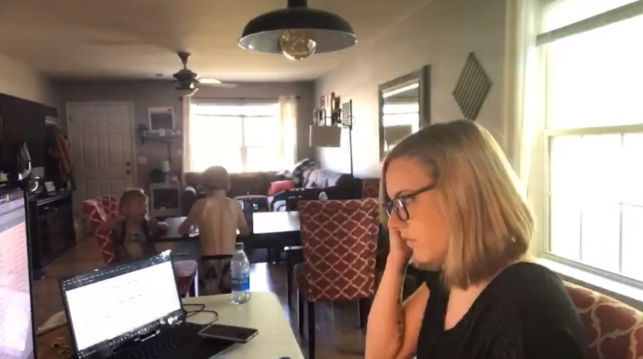 Ahora, ella se encuentra sola en casa con sus tres hijos, mientras debe continuar trabajando a distancia para su empresa. Para enseñar a otras personas que no todo suena tan fácil como parece, Katie colocó una videocámara, con la que capturó sus primeras dos horas de trabajo en casa con sus tres hijos.
