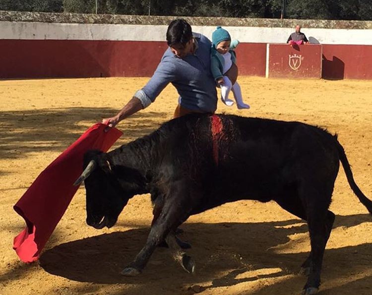 Sitios como los que puede frecuentar un torero, en este caso Fran Rivera, que ha levantado la polémica en las redes sociales al publicar esta foto en Instagram toreando con su hija de 5 meses en brazos.