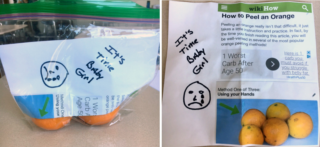 En un primer momento barajó la posibilidad de ponerle en la bolsa una nota con dinero dentro. Algo así como "Ya eres mayor, puedes comprarte tu propio desayuno", pero pronto desechó la idea al acordarse de las naranjas. Junto a ellas podría agregar una nota en tono de humor (la que veis en la foto) explicando lo que hay que hacer para pelar una naranja. Así ella se daría cuenta de que tenía que dar ese paso, y a la vez sentiría que su padre aún le prepararía el desayuno si fuera posible.