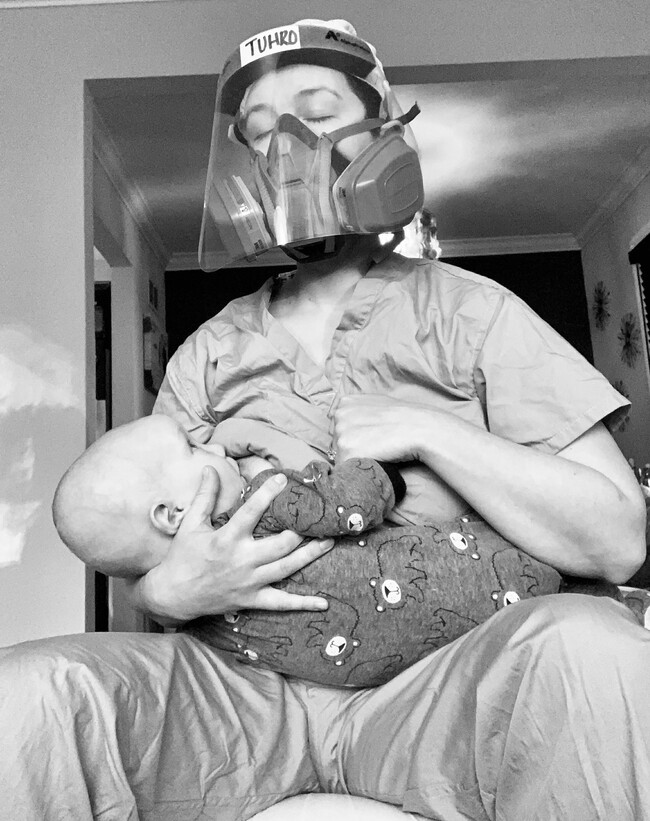 Esta es la foto de la enfermera de la UCI del Centro Médico Bautista de Missouri (Estados Unidos), Mandi Tuhro, aprovechando un descanso en su trabajo para amamantar a su bebé. Se ha convertido en un símbolo, en la imagen de lo que significa ser madre en tiempos de coronavirus.