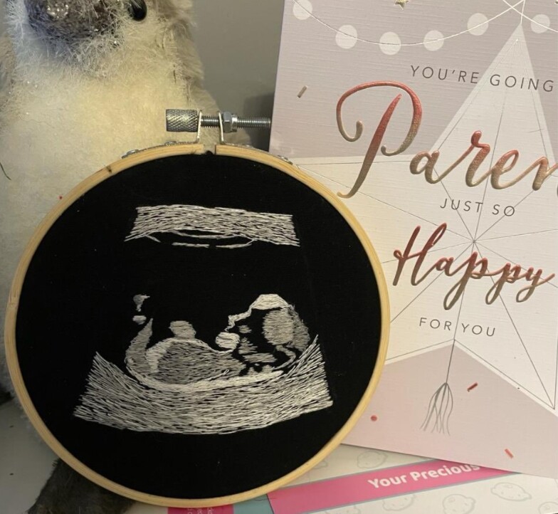 Received this amazing surprise today... it’s an embroided tactile version of our 12 week baby scan, so for the first time as a blind dad to be, I’m able to build a picture of our baby scan through touch ❤️