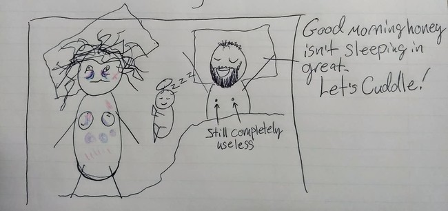 El marido asegura que también se involucra en la crianza de las niñas, que se levanta por las noches lo que haga falta. Pero esa noche, había dormido del tirón cuando su mujer se había despertado varias veces para amamantar a su hija. Y al preguntarle por la mañana por su mal humor, ello tuvo la genial idea de explicárselo en dibujos.