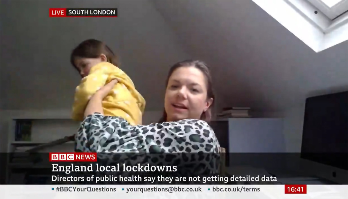 Ahora la historia se repite con la profesora Clare Wenham, quien estaba siendo entrevistada en vivo, mientras su hija aparecía en el fondo de la entrevista "decorando" la oficina, para posteriormente preguntar con insistencia el nombre del presentador.