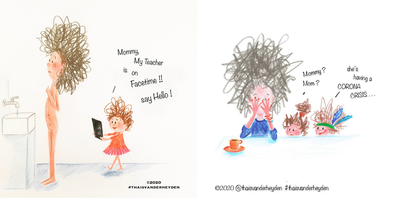 Thais Vanderheyden es una ilustradora y madre de cuatro hijos que vive en Bélgica. Tanto ella como su esposo trabajan desde casa de forma independiente mientras sus hijos asisten a la escuela, pero cuando inició la cuarentena, se encontraron los seis en casa intentando balancearlo todo.