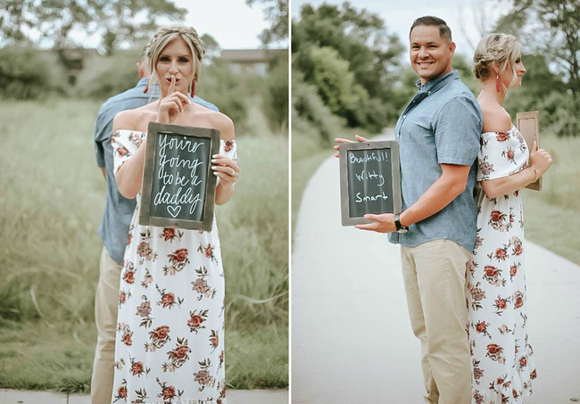 Anteriormente te habíamos mostrado una sesión de fotos muy similar, en la que la madre también le anunciaba durante una sesión de fotos y a través de una pizarra que un bebé venía en camino. Sin duda es una bonita manera no solo de anunciar un embarazo, sino de capturar el momento justo en que damos la noticia para toda la vida.