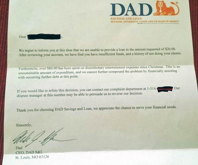 Esta es la traducción de la carta que su padre, como CEO del banco le ha remitido a su hijo en contestación a su petición para un préstamo de 20$ (el texto entre paréntesis es mío, no pertenece a la carta original):